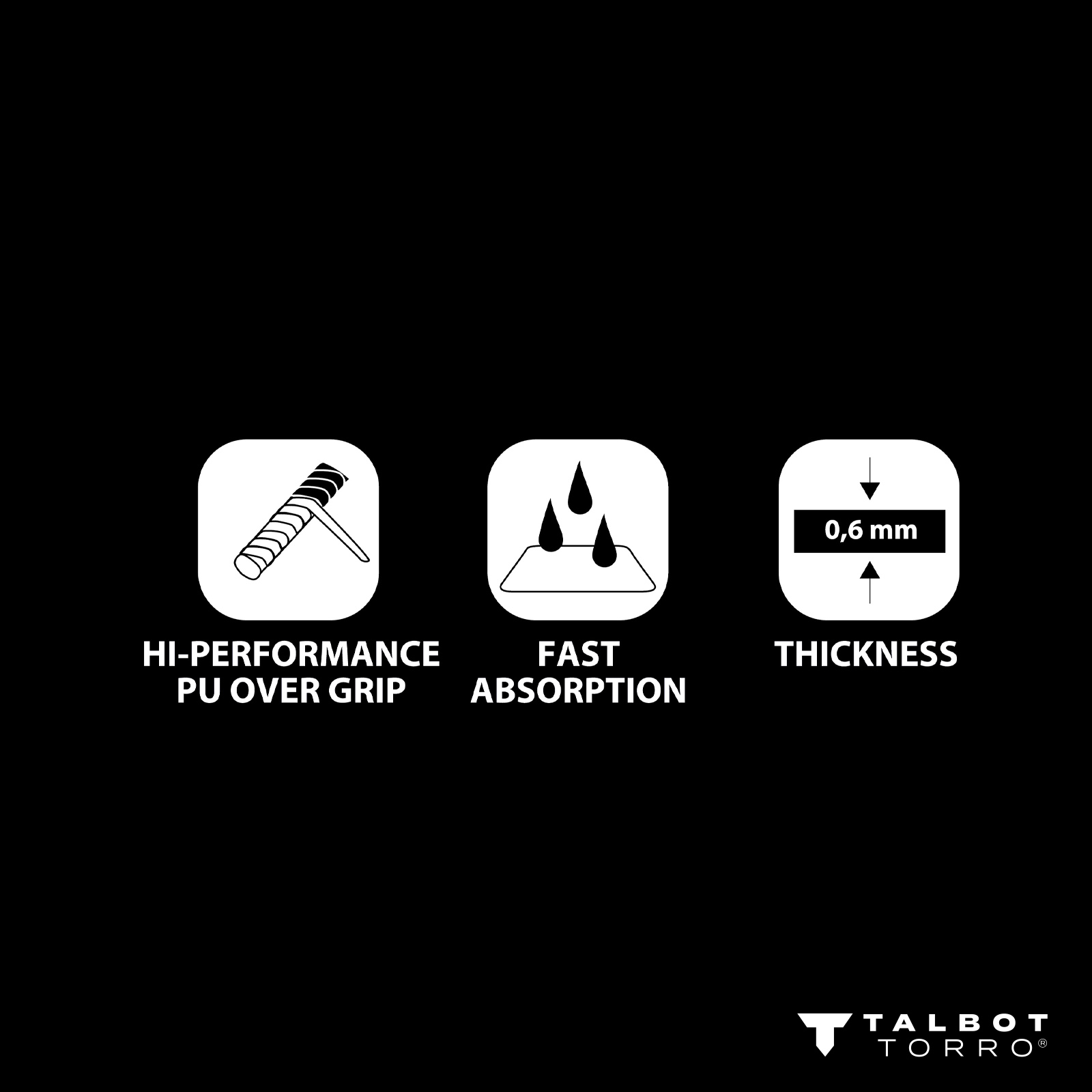 Badmintonová omotávka TALBOT TORRO Overgrip je vďaka svojej dĺžke (113 cm) ideálny univerzálny overgrip pre bedmintonové, squashové alebo tenisové rakety. Dá sa ale použiť napríklad aj na rakety na stolný tenis alebo florbalové hokejky. Vysoko výkonný polyuretánový materiál (PU) s hrúbkou 0,6 mm sa skvele drží a extrémne pohlcuje vlhkosť. Aj keď máte vlhké, spotené ruky, raketa sedí bezpečne a nešmýka sa v ruke. Neutrálny čierny opasok sa hodí ku každej farbe rakety. Tenký overgrip alebo overwrap páska je prebalená cez základnú grip pásku, ktorou je každá raketa vybavená z výroby. Lacnejší, protišmykový overband tak chráni drahšiu základnú omotávku. Omotávka by sa mala pravidelne vymieňať. Súprava obsahuje 3 roličky Overgripu.
