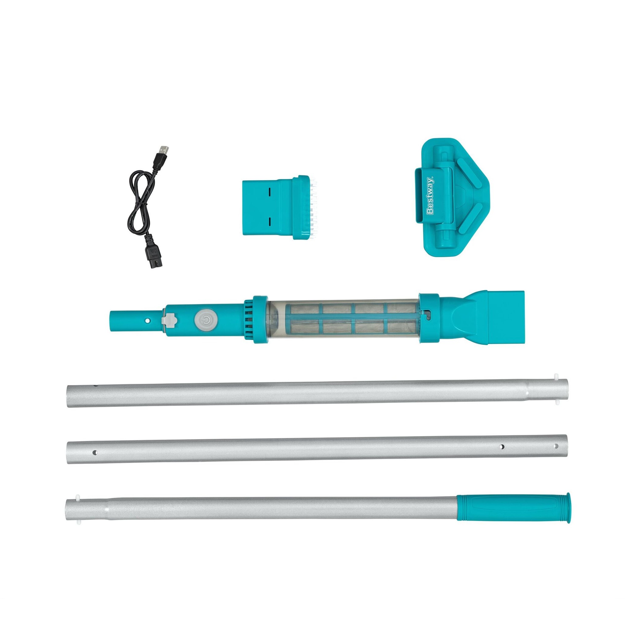 Tyčový bazénový vysávač BESTWAY AquaSurge nepotrebuje pripojenie k externým hadicám ani napájací kábel. Akumulátorový pohon a dva metre dlhá tyč z neho robí efektívny nástroj na údržbu bazénov s odporúčanou celkovou plochou až 6,1 metrov štvorcových. Vysávač je možné osadiť dvoma rôznymi hlavami na čistenie rovných plôch alebo rohov bezénu. Vysávač je napájaný lítiovou batériou s pracovným cyklom až 50 minút. Integrovaný zásobník na nečistoty má kapacitu 0,54 litra.
