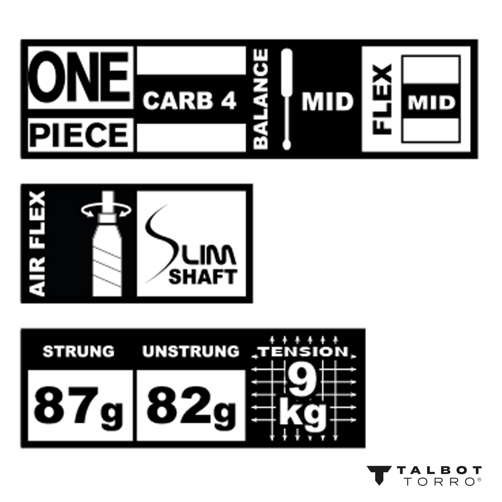 Nová raketa TALBOT TORRO Isoforce 511 je šikovná všestranná raketa pre ambicióznych rekreačných športovcov so štíhlym rámom a shaftom (ľahká a aerodynamická). Rám je vyrobený z najlepšieho Carbon 4 (Hi-Modulus grafit, ľahší a tvrdší ako klasický grafit) a má kvalitnú jednodielnu konštrukciu. Nízka hmotnosť (82 g bez výpletu alebo 87 g vrátane) a stredné vyváženie z nej robí príjemnú raketu na hranie. Vďaka izometrickému tvaru hlavy je sweet šport (optimálny bod úderu) mierne zväčšený, vďaka čomu je raketa zhovievavejšia k chybám v podobe neoptimálnych zásahov. Stredná flexibilita shaftu je dobrým kompromisom medzi kontrolou a výkonom. Vďaka Airflex grip cap (PU trubice medzi násadou a rukoväťou) je shaft v rukoväti podoprený mäkko a pružne => dĺžka flexu a celková ohybnosť shaftu sa zväčšuje, sila sa zvyšuje. Súčasne má PU účinok znižujúci vibrácie. Raketa Isoforce 511 je vypletená multifilnou strunou Talbot-Torro Galaxy s hrúbkou 0,8 mm - odolná a elastická. Maximálne odporúčané napätie je 9 kg.
