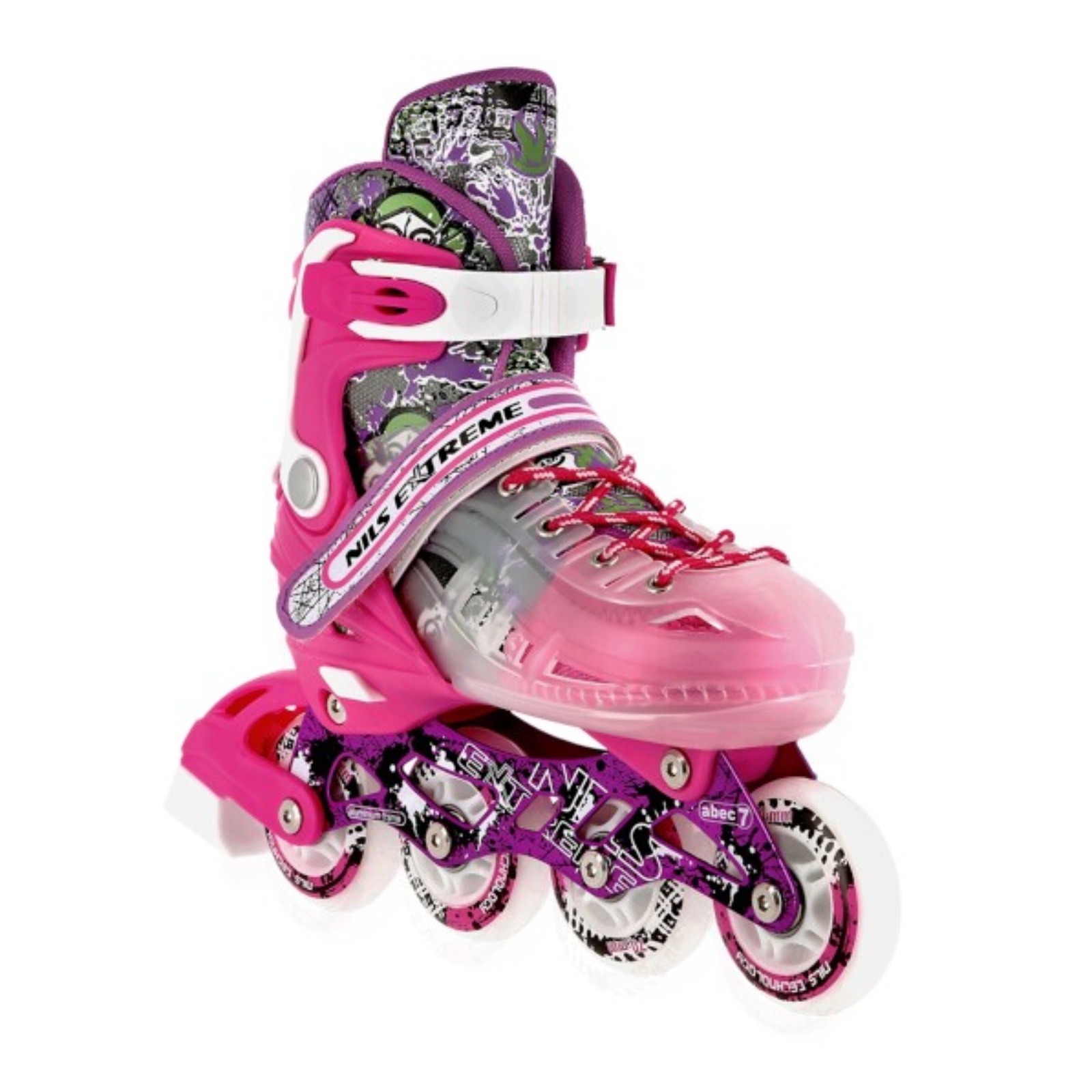 Rastúce kolieskové korčule NILS EXTREME NH18122 s variabilným zostavením podvozku a vymeniteľným nožom na ľad sú vhodné na rekreačnú jazdu. Výhodou je zmena veľkosti stlačením jediného tlačidla. Priesvitná, predná časť tvrdej topánky dáva vyniknúť modernému dizajnu vnútornej vložky. Zapínanie je riešené klasickou troj-kombináciou (šnurovanie, opasok na suchý zips, dvojsekčná pracka). Kolieska sú osadené ložiskami ABEC 7 pre rýchlu jazdu, korčule sú tak vhodné pre zdatnejších jazdcov.
