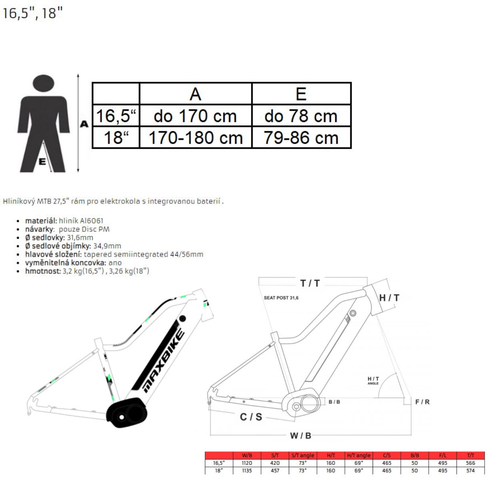 Horský elektrobicykel MAXBIKE Torvi 27.5 bielo-čierny - veľ. rámu 16,5" - Parametre