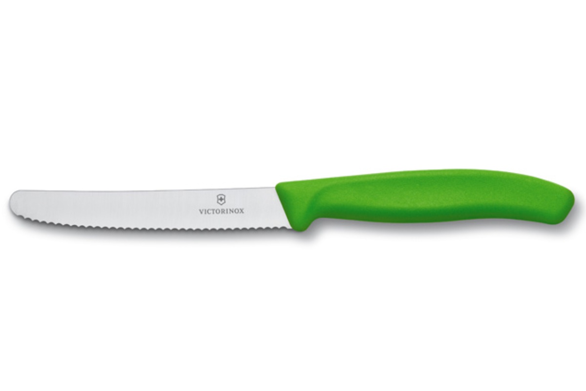 Kvalitný nôž od švajčiarskeho výrobca Victorinox je ideálny na krájanie paradajok, ale aj akékoľvek iné zeleniny a ovocia. Je ľahký, ostrý, má zaguľatený koniec čepele a vlnovej ostrie. Už nikdy ho nebudete chcieť vymeniť. Je ideálnym pomocníkom pri úprave nielen zeleniny a ovocia, ale aj ďalších potravín. Dĺžka čepele je 11 cm.