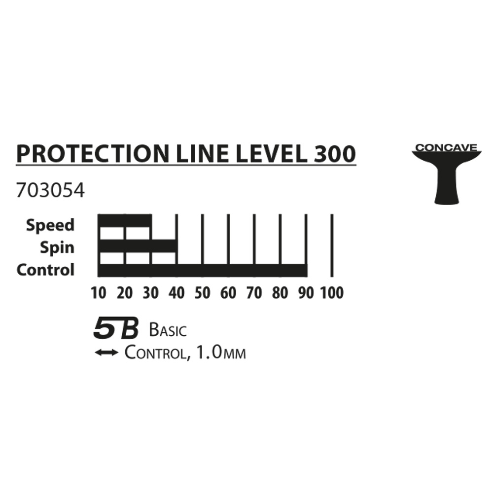Základným modelom Donic-Schildkröt Protection Line je raketa S300, ktorá je vybavená ITTF schváleným poťahom Schildkröt Jade (hladký povrch, pupienky na vnútornej strane) a 1,0 mm špongiou. Je to optimálna výuková raketa na začiatok s hrou stolného tenisu. Guma schválená ITTF vám umožňuje najprv experimentovať s rotáciou / hra s rezaním. Rukoväť má obľúbený konkávny tvar, a preto skvele padne do ruky. Raketa ponúkne porametre: speed 30 zo 100, spin 40 zo 100 a control 90 zo 100.