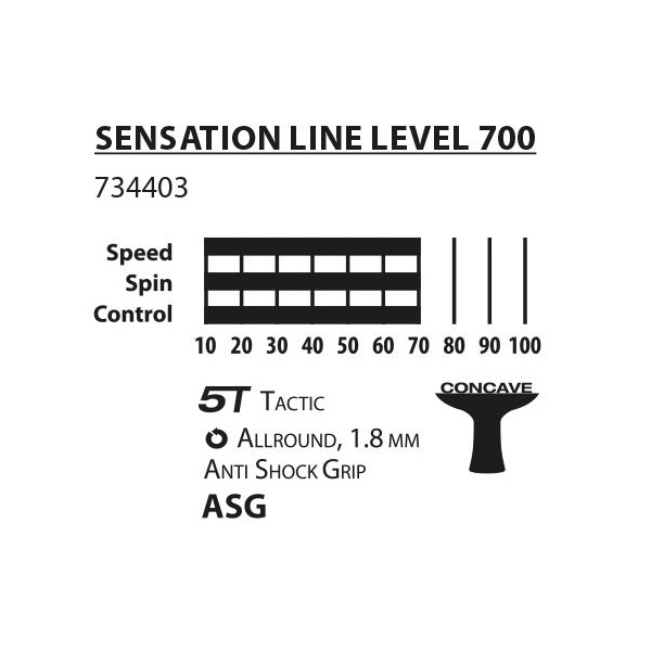 Raketa na stolný tenis DONIC Sensation 700 je raketa s veľmi kvalitným spracovaním, ktorá je vybavená protišmykovou „Anti Shock Grip“ (ASG). Mäkký a veľmi odolný penový poťah absorbuje pot a zaisťuje vynikajúcu priľnavosť a väčšie pohodlie. Rakety „Sensation Line“ sú ideálne pre ambicióznych hobby a voľnočasových hráčov, obľúbené sú tiež v školských kluboch. Model Sensation 700 ASG boduje protišmykovou gumou Schildkröt Avantgarde, ktorá umožňuje ľahké prenesenie rôznych herných techník na loptu. Huba s hrúbkou 1,8 mm umiestnená medzi gumou a drevom generuje poriadnu dávku sily a vyššie rýchlosti lopty pri rovnakej sile sú výhodou oproti tenšej a teda lacnejšej hube.