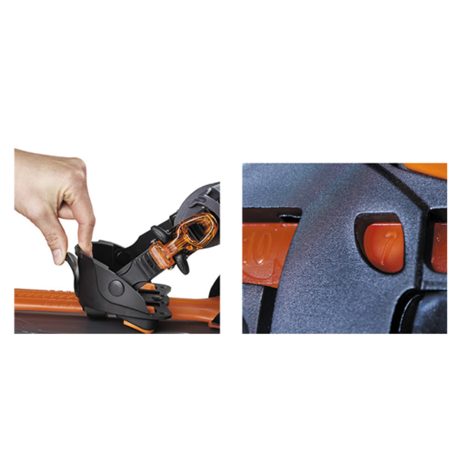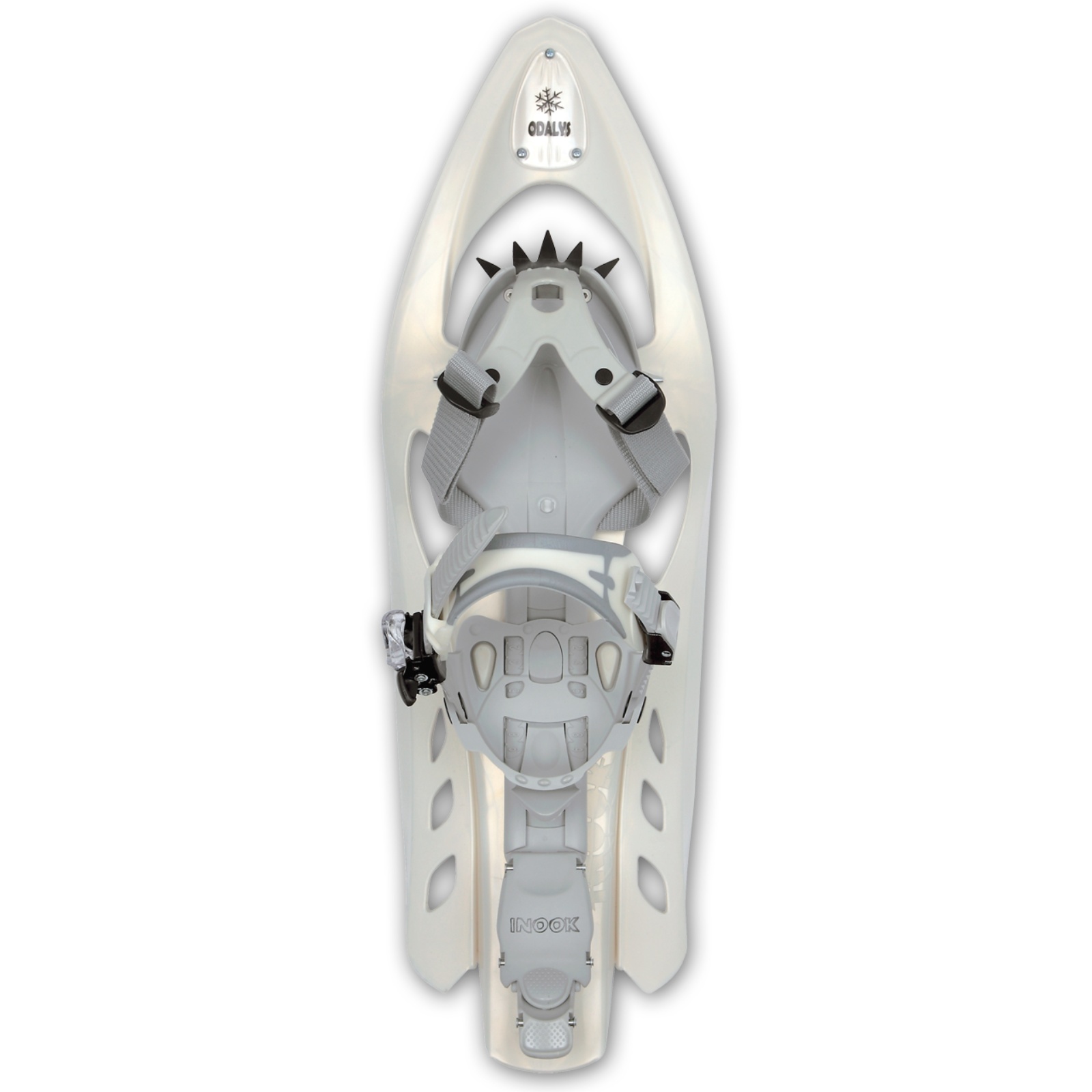 Snežnica vďaka posuvnému systému uchytenia päty je veľmi ľahko nastaviteľná pre akúkoľvek veľkosť topánky. Maximálna veľkosť topánky je 9. Inook robí jedinečný systém zamykania päty. Zamknutie či odomknutie sa dá jednoducho urobiť palicou postojačky, ako poznáme zo skialpového viazania. Už žiadne problémy pri prekračovaní spadnutých stromov a podobne. Lišta, po ktorej sa posúva uchytenie päty, je z vystuženého materiálu. Preto možno blokovací systém použiť aj ako celkom užitočné podloženie päty, ktoré tiež poznáme zo skialpov. Za zmienku stojí aj chytro riešené upínanie topánky. Dotiahnutie topánky je pomocou račne ako poznáme zo snowboardového viazania. Na račni je špeciálny systém, vďaka ktorému môžeme račňu ľahko povoliť aj v rukaviciach. Navyše možno upínací pásik vystrediť pomocou druhej račne a prispôsobiť tak objemu topánky.