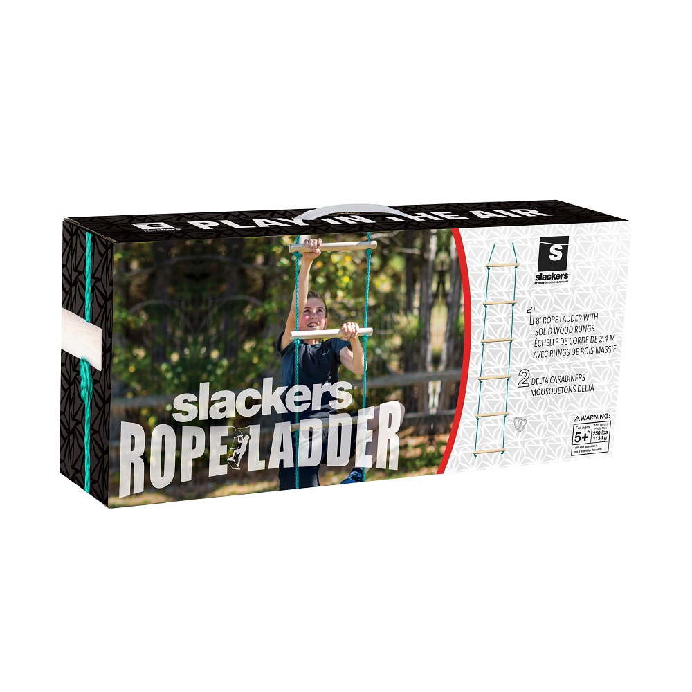 Robustný a všestranný povrazový rebrík SLACKERS Ninja 2,5 m z materiálu odolného proti poveternostným vplyvom. Syntetické lano dlhé 2,5 m, so 6 guľatými, robustnými drevenými priečkami (priemer 3 cm, šírka 38 cm). Rebrík je možné ľahko pripevniť pomocou dvoch priložených delta karabín aj bez použitia náradia. Ideálny doplnok k záhradným hojdačkám Ninjaline, detským domčekom na stromoch apod. Maximálna nosnosť: 113 kg.