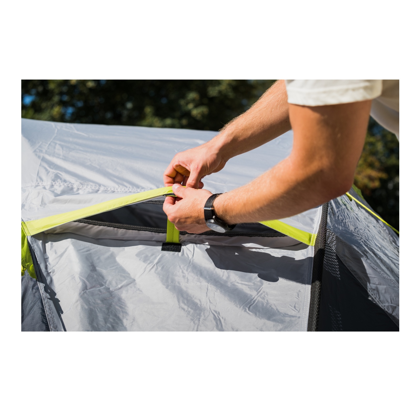 Samonosný turistický stan s dvoma skríženými prúty, tvoriacimi spálňu a tretí predsunutá tyč vytvára priestrannú predsienku s integrovanou podlážkou.Zatemnitelná priehľadné okná v predsieni dodávajú dostatok svetla vo vnútri.
