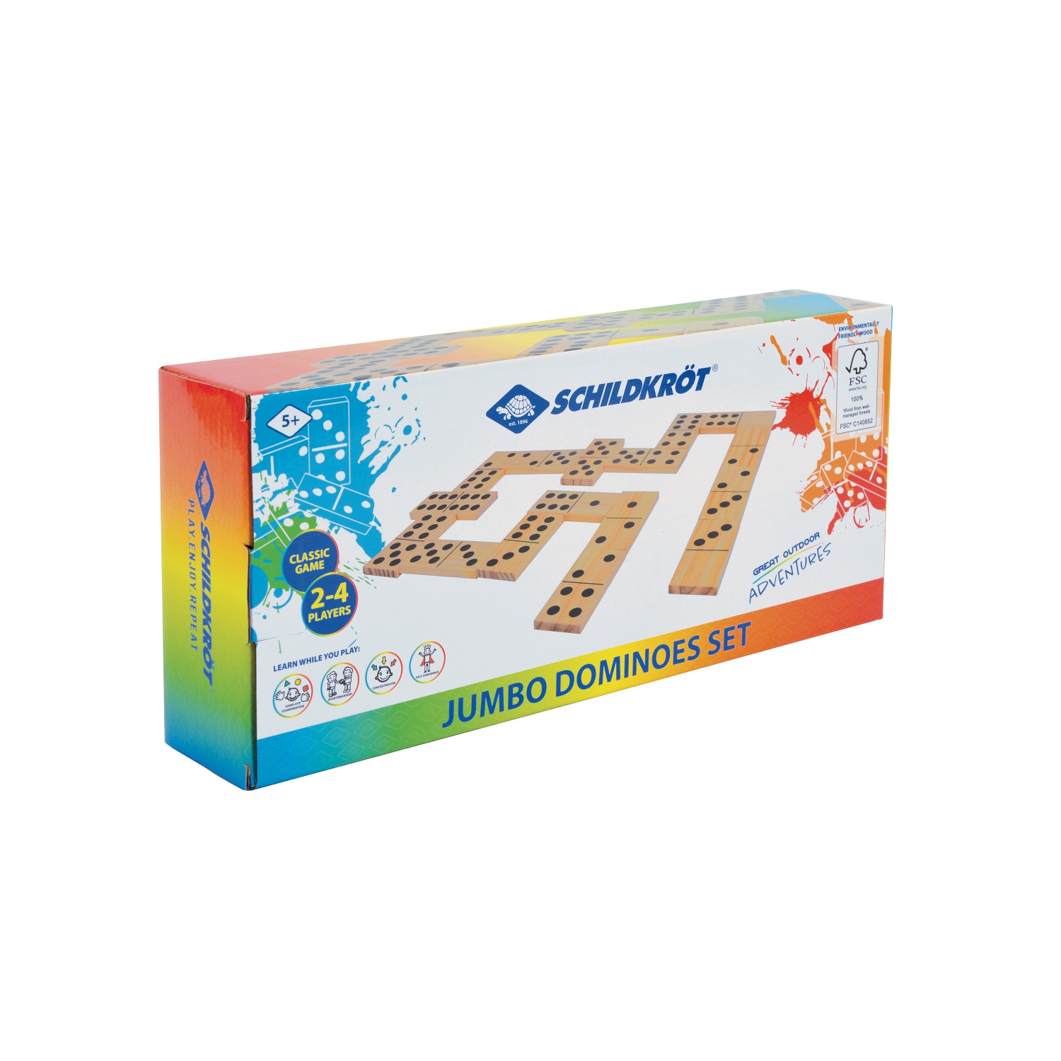 Záhradná hra SCHILDKROT Jumbo Domino - starobylá čínska klasická hra, ktorú do Európy kedysi priviezol Marco Polo. 28 veľkoformátových kameňov domina s rozmermi 13 x 6 x 1 cm je vyrobená z prírodného dreva s certifikátom FSC s čiernou podtlačou. Praktické skladovanie a jednoduchá preprava v sieťovanej taške so sťahovacou šnúrkou. Všetko je zabalené v kartónovej krabici.